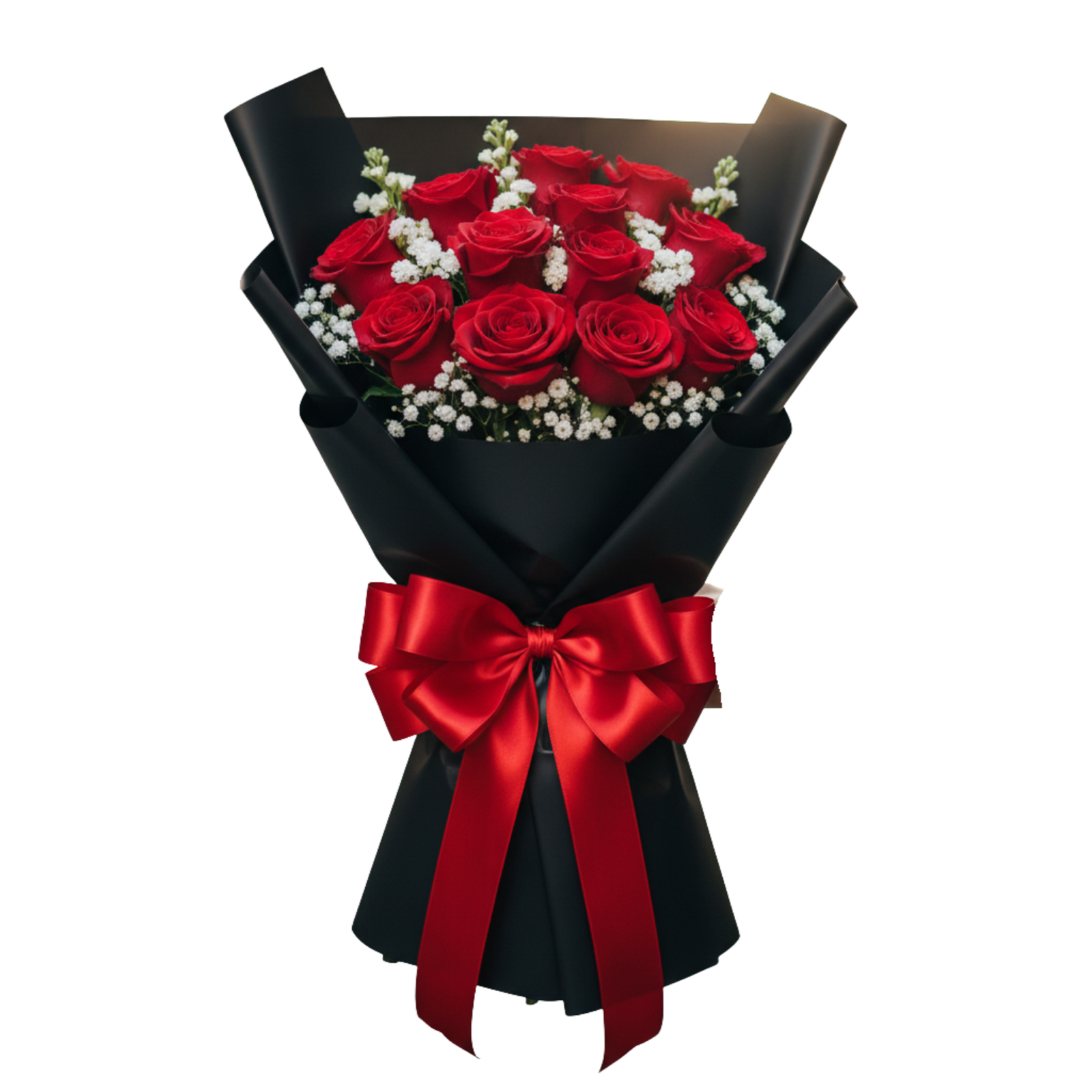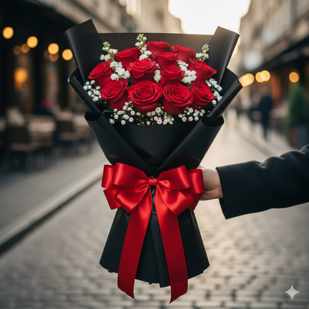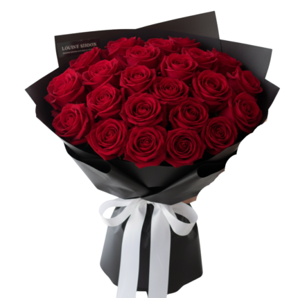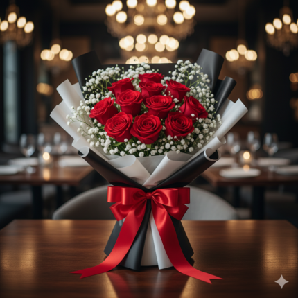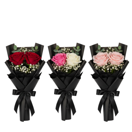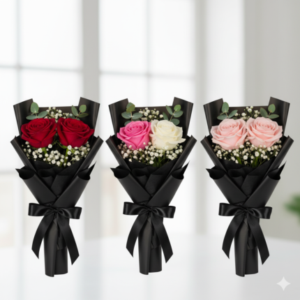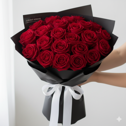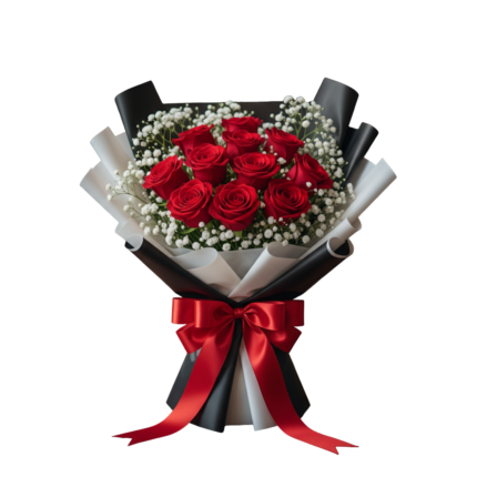 A perfect blend of passion and elegance – this bouquet features stunning red roses paired with delicate white fillers, all wrapped in sleek black paper and tied with a luxurious red satin ribbon. It’s a timeless choice for romantic gestures, anniversaries, or celebrating someone special.