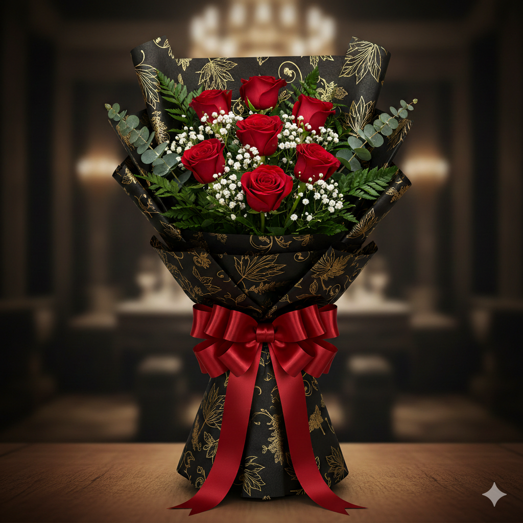 A perfect blend of boldness and luxury – this bouquet features fresh red roses accented with baby’s breath and greens, all wrapped in an eye-catching black and gold paper and finished with a rich red satin ribbon. It’s a premium choice for upscale celebrations, anniversaries, or romantic surprises.