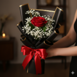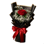 A timeless gesture of love and elegance — Solo Bloom features a single premium red rose paired with delicate baby’s breath. Wrapped in luxurious black paper with golden accents and tied with a vibrant red satin ribbon, this bouquet is a simple yet powerful expression of affection.