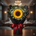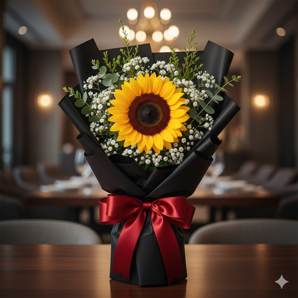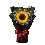 Brighten someone’s day with this Fresh Sunflower Bouquet, beautifully wrapped in elegant black paper and finished with a red satin ribbon. Known as the flower of positivity and happiness, sunflowers make the perfect gift for joyful celebrations and heartfelt surprises.